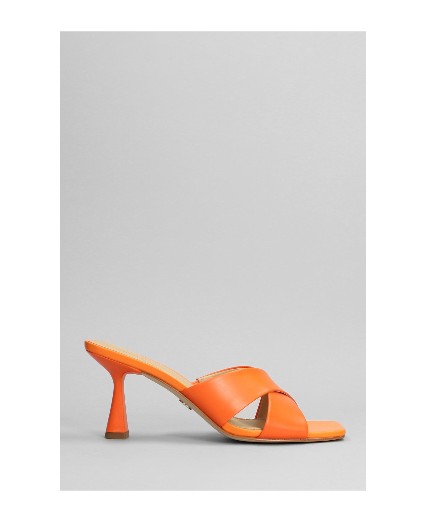 Clara Mule Sandals in orange leather, cross straps, elongated square toe, heel 85mm, leather sole, 100% leather, Made in Vietnam