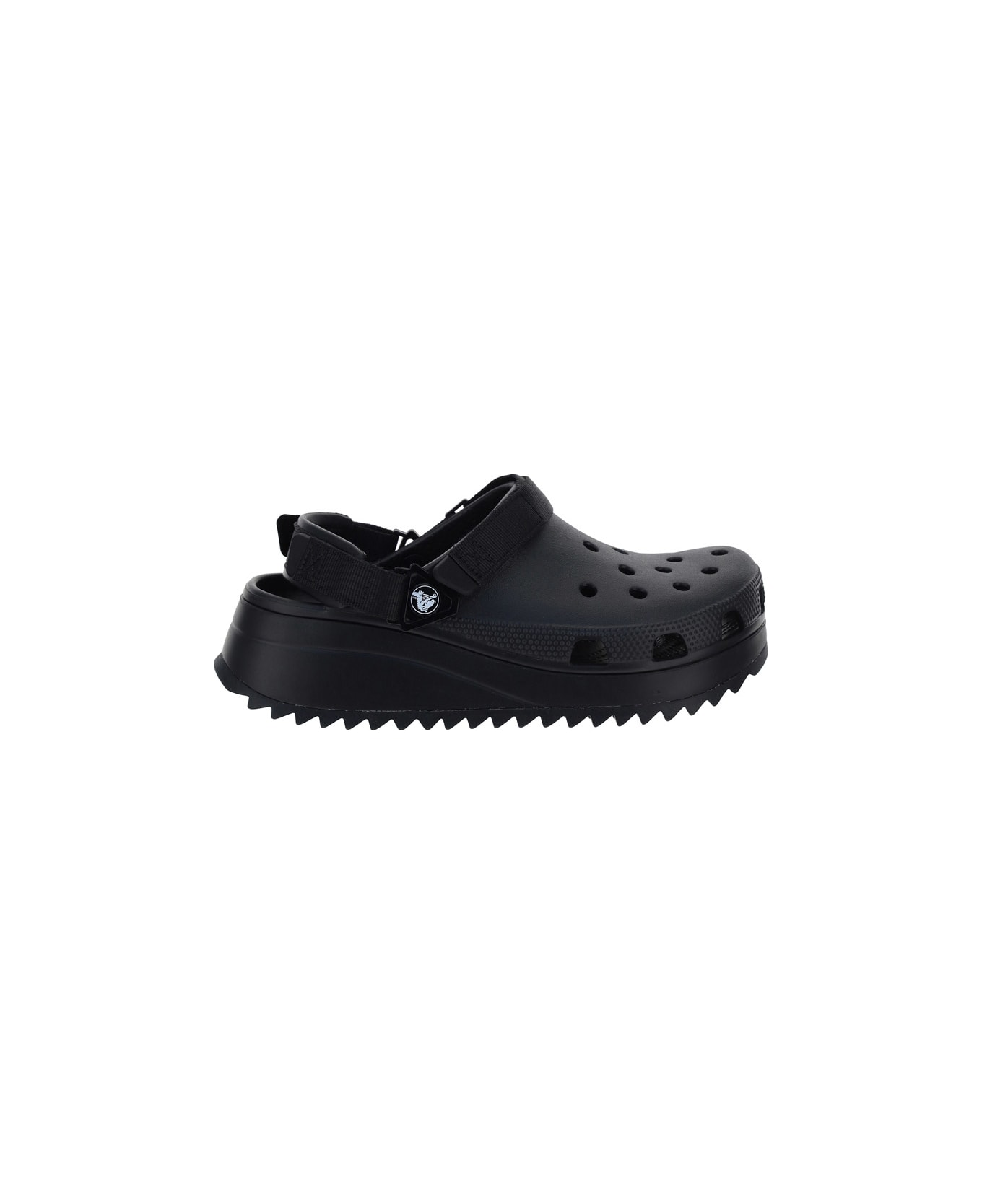 Classic hiker clogs by crocs, serrated rubber sole, perforated design on front, swivel heel strap, instep strap with adjustable strap closure, raised sole. Composition: 100% % Rubber, 100% % Rubber