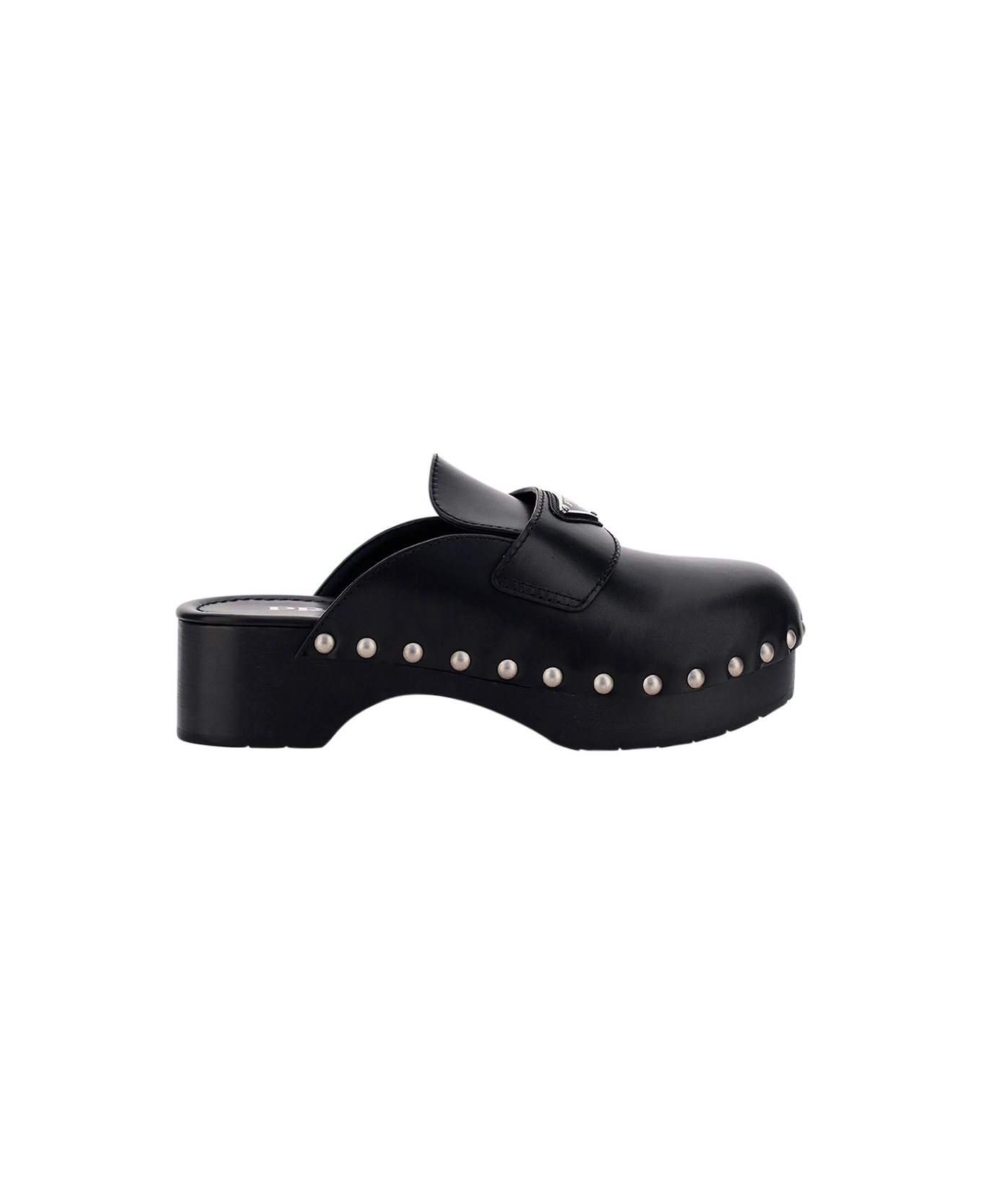 Calfskin clogs by prada, slip-on style, metallic side stud detail, wedge heel, round toe, iconic brand logo triangle embossed on front tray. Composition: 100% % Calf Leather Bos Taurus, 100% % Rubber