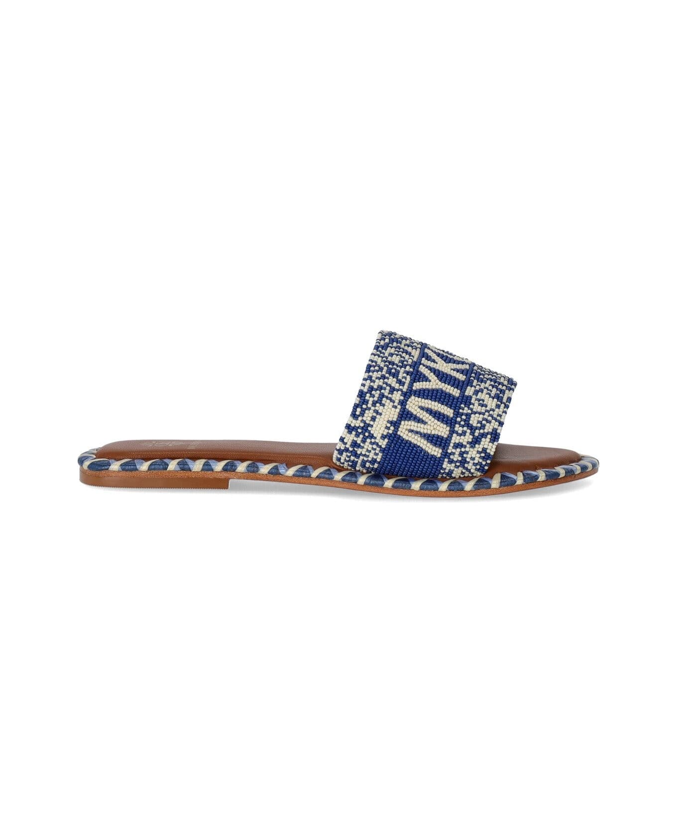 De Siena Mykonos slide made of light brown leather, embellished with beads in shades of blue on the front and tricolor raffia finishes on the insole. Leather sole, heel height 1 cm.