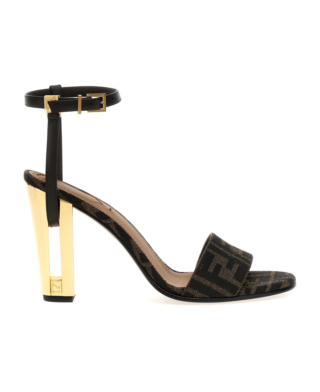 'Delfina' woven sandals with jacquard logo, leather details, ankle strap, contrast metal heel with cut-out detail. Composition: 65% polyamide 35% cotton