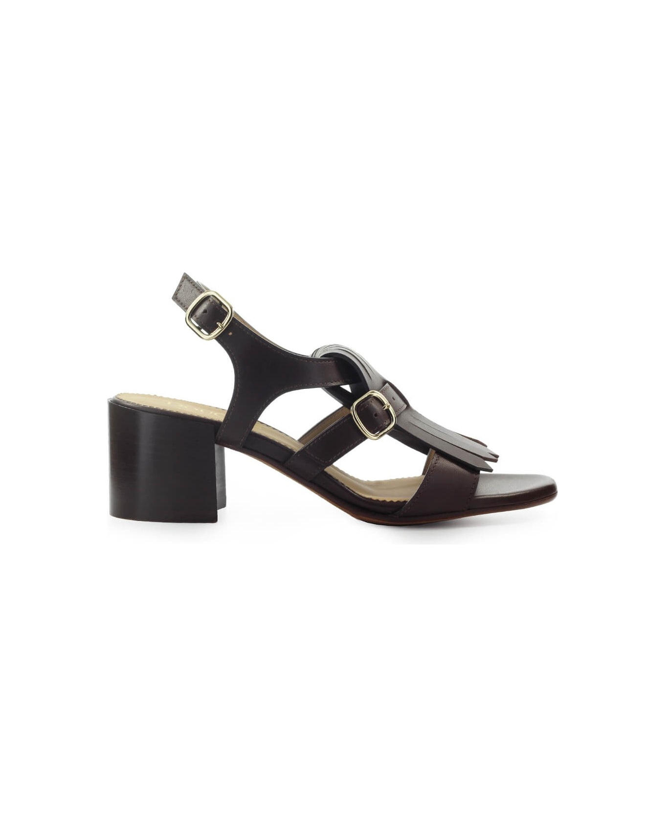 Doucal's sandal made of dark brown leather, embellished with front fringe and strap with golden metal buckle. Rounded toe and ankle closure. Leather sole with wide heel, height 6 cm