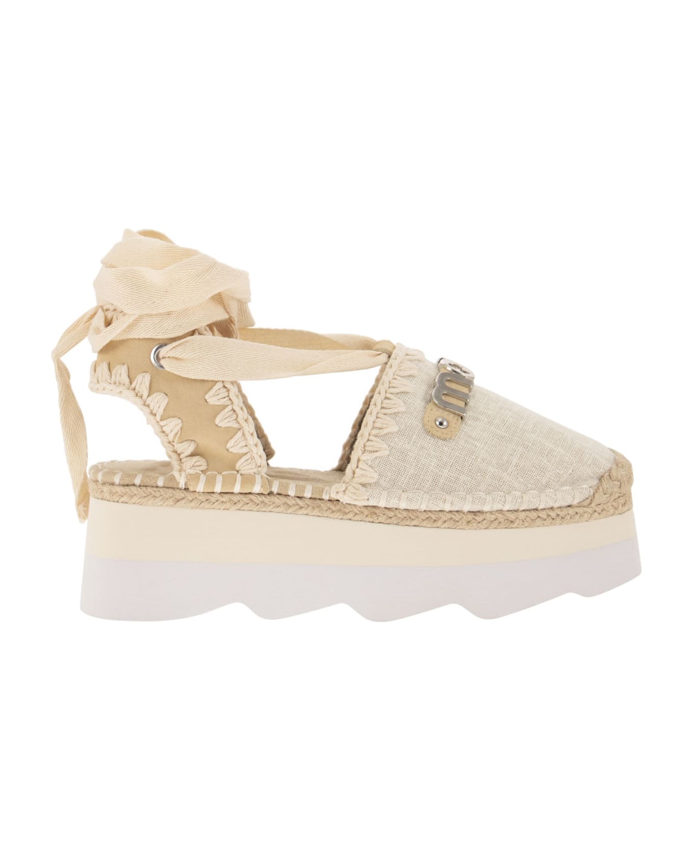Evoking a timeless summer mood, these platform espadrilles from Mou. They are made with leather and fabric uppers with a logo and a platform finished in woven rope, for a height that doesn't have to compromise on comfort. - Leather and fabric lining - jute decoration - Ankle lacing DESIGNER ID: MU. SW591000K CRU