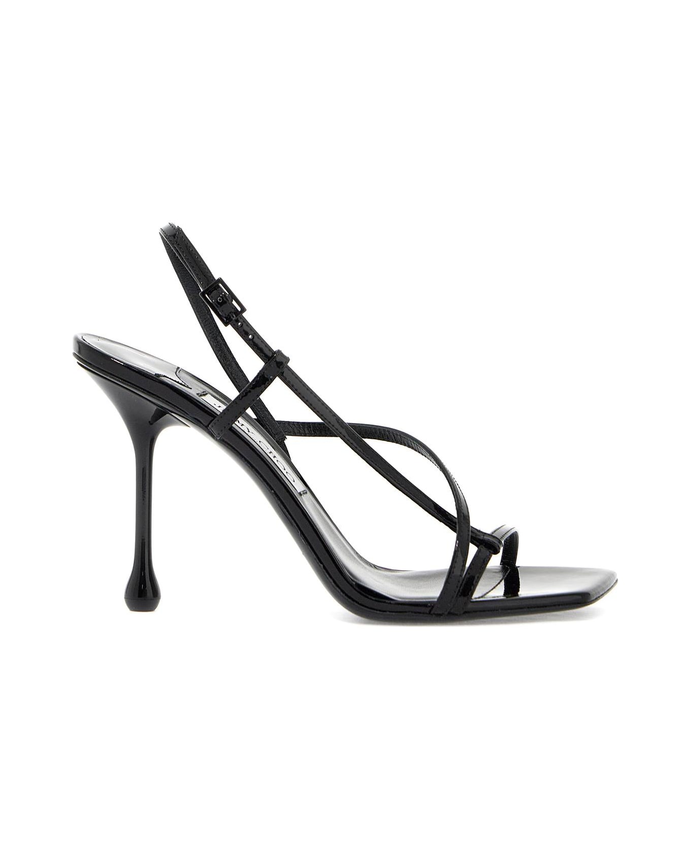 The Etana Jimmy Choo sandals feature a sculptural silhouette with a glossy drop heel and are made of patent leather with criss-cross straps and an adjustable ankle strap. They have a square toe, a leather insole, and a leather sole with rubber inserts for added traction. Composition: 100% calf leather