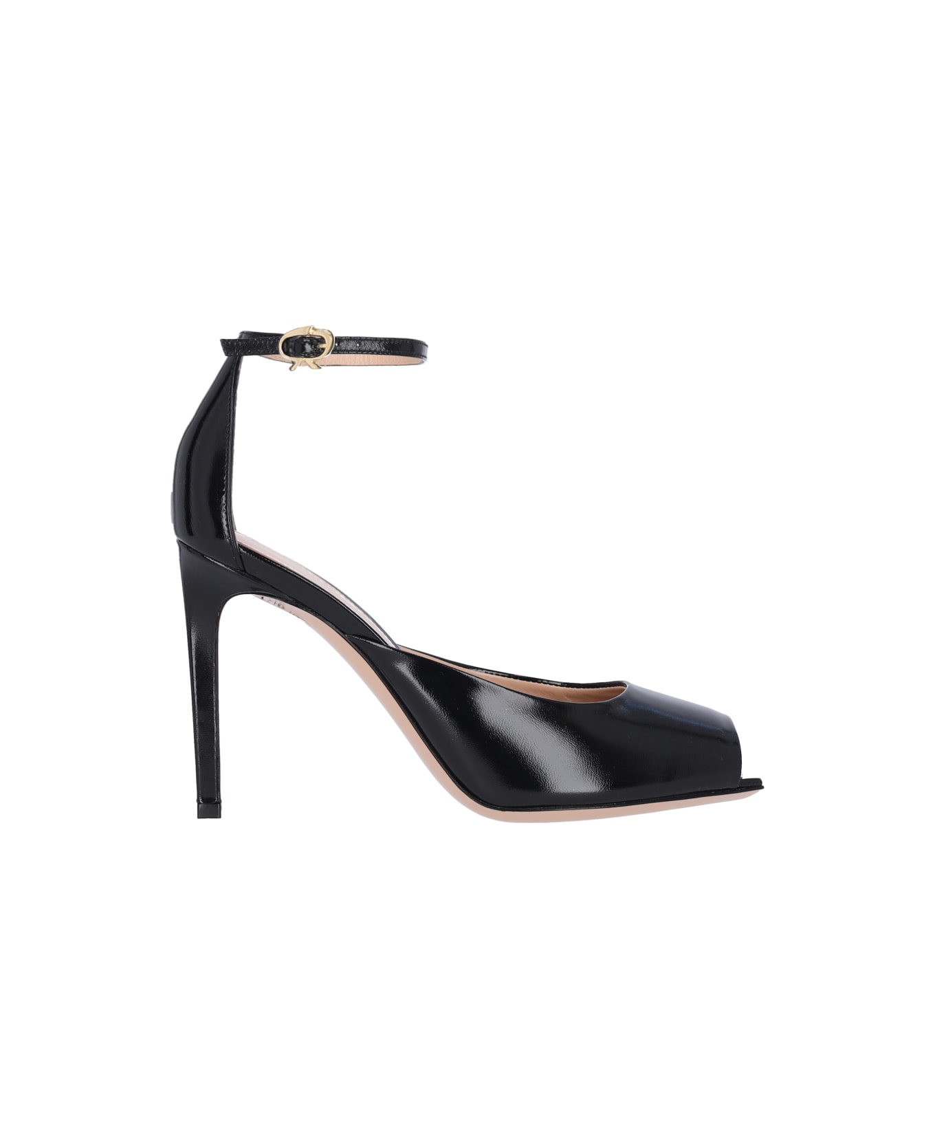 Gianvito Rossi Ethel sandals in shiny black nappa leather with square toe, top band, adjustable strap at the back ankle, gold metallic Ribbon logo buckle detail, slip-on fit, stiletto heel, beige leather sole.