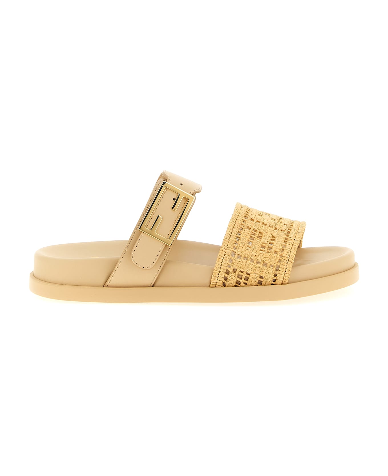 'Fendi Feel' leather slides with mesh front band and FF pattern in woven and perforated viscose raffia, adjustable strap with gold metal 'FF Baguette' buckle, rubber sole. Composition: 50% polyester, 50% viscose