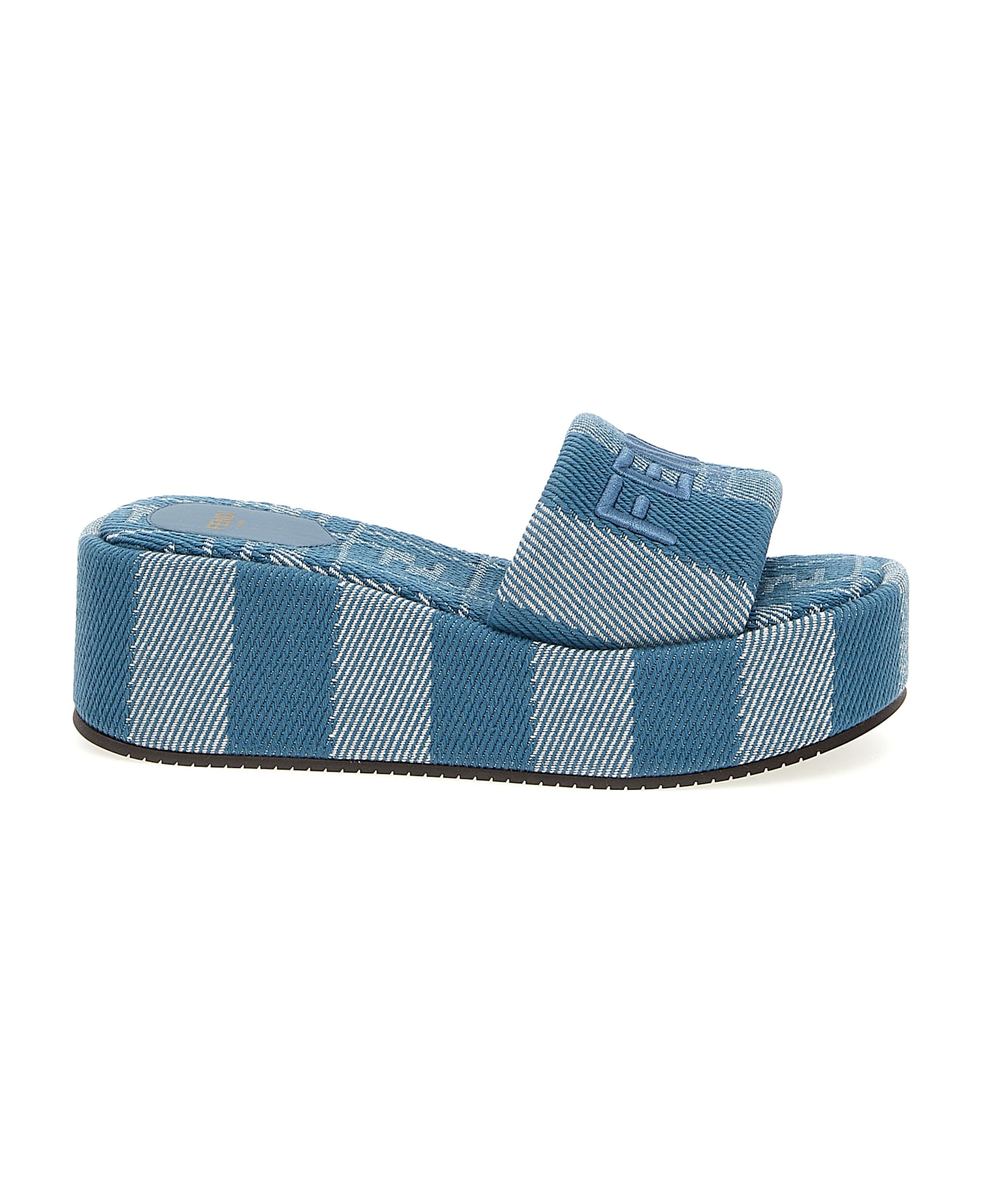 Fendi Sunshine' denim-effect jacquard slides with Pecin stripes, front logo embroidery, jacquard denim insole with iconic tone-on-tone FF pattern, and platform sole. Composition: 100% cotton
