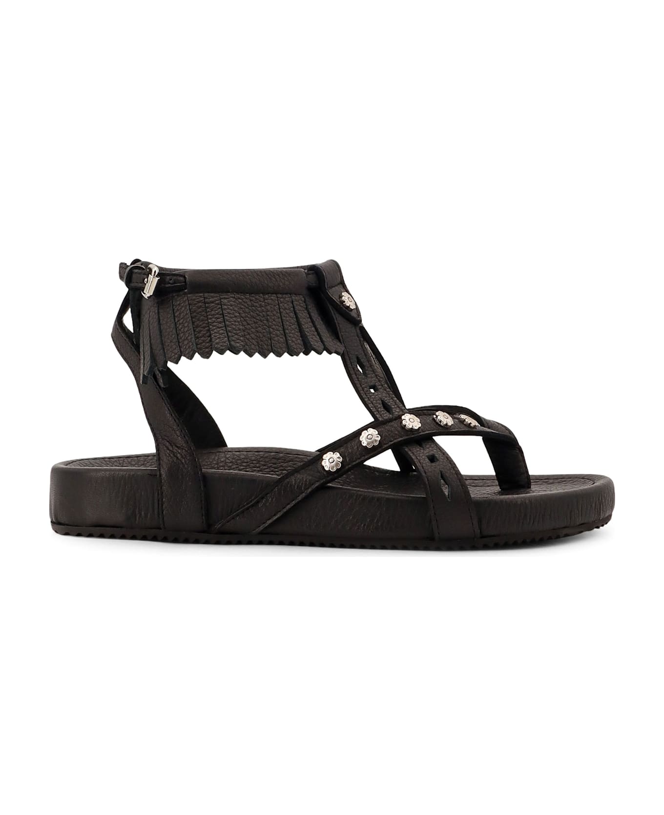 SKU: SD0208FAC1B09S_01BK - Closure with ankle strap with fringe thong sandals with stitching metal flowers frontal straps with openwork logo engraving on the upper rubber leather leather