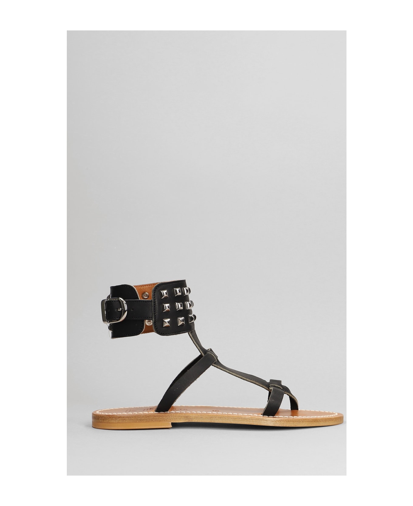 Forban Flats in black leather, ankle detail, studs detail, open toe, iconic logo, leather sole, 100% leather, Made in France