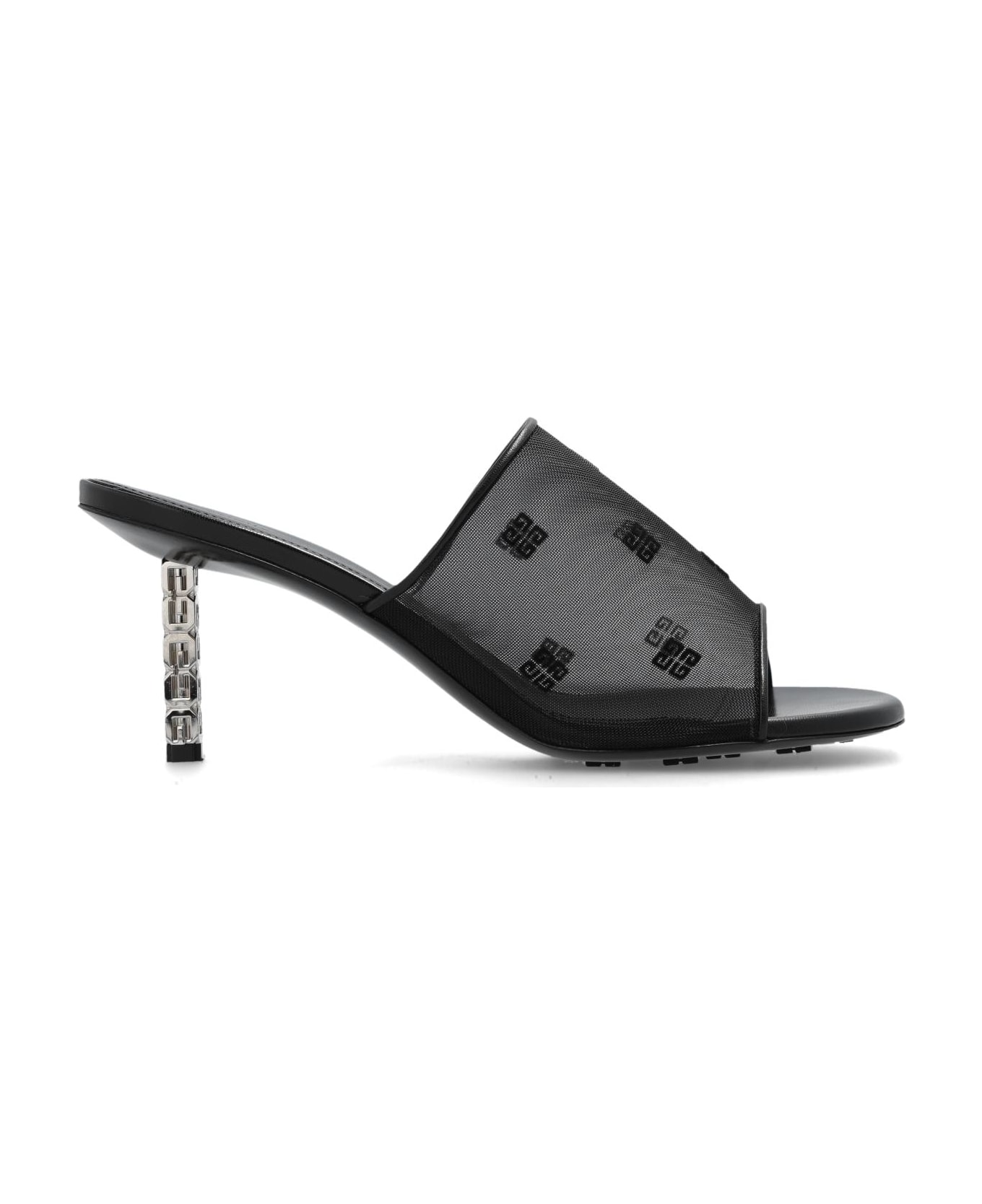 Black 'G-Cube' heeled mules from Givenchy. Made of mesh with a velvet-finished monogram pattern and leather, this pair features a decorative heel in silver-tone and black sole constructed from leather and rubber. Composition: Outer Layer: Leather Rubber Inner Layer: Leather Sole: Leather Rubber