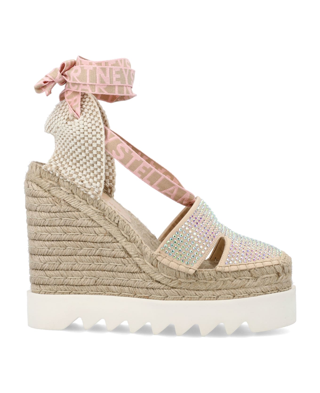 Gaia Crystals Wedge Espadrilles By Stella Mccartney. Featuring: Square Toe Crystals Embellished Upper Stella Mccartney Logo Ribbon Ankle Lace-up Fastening Natural Jute Stacked Wedge Midsole White Signature Saw-edge Micro Sole Heel: 14 Cm Platform: 5 Cm