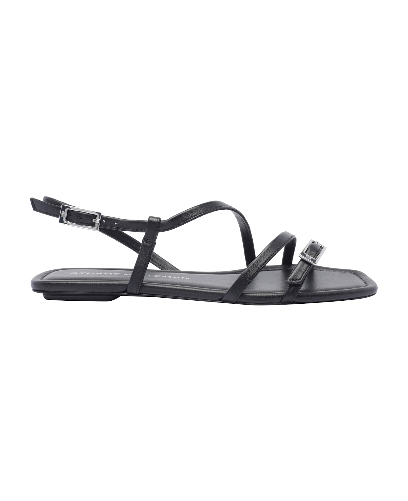 Stuart Weitzman black Georgie sandals, round toe, lateral buckle closure, leather upper