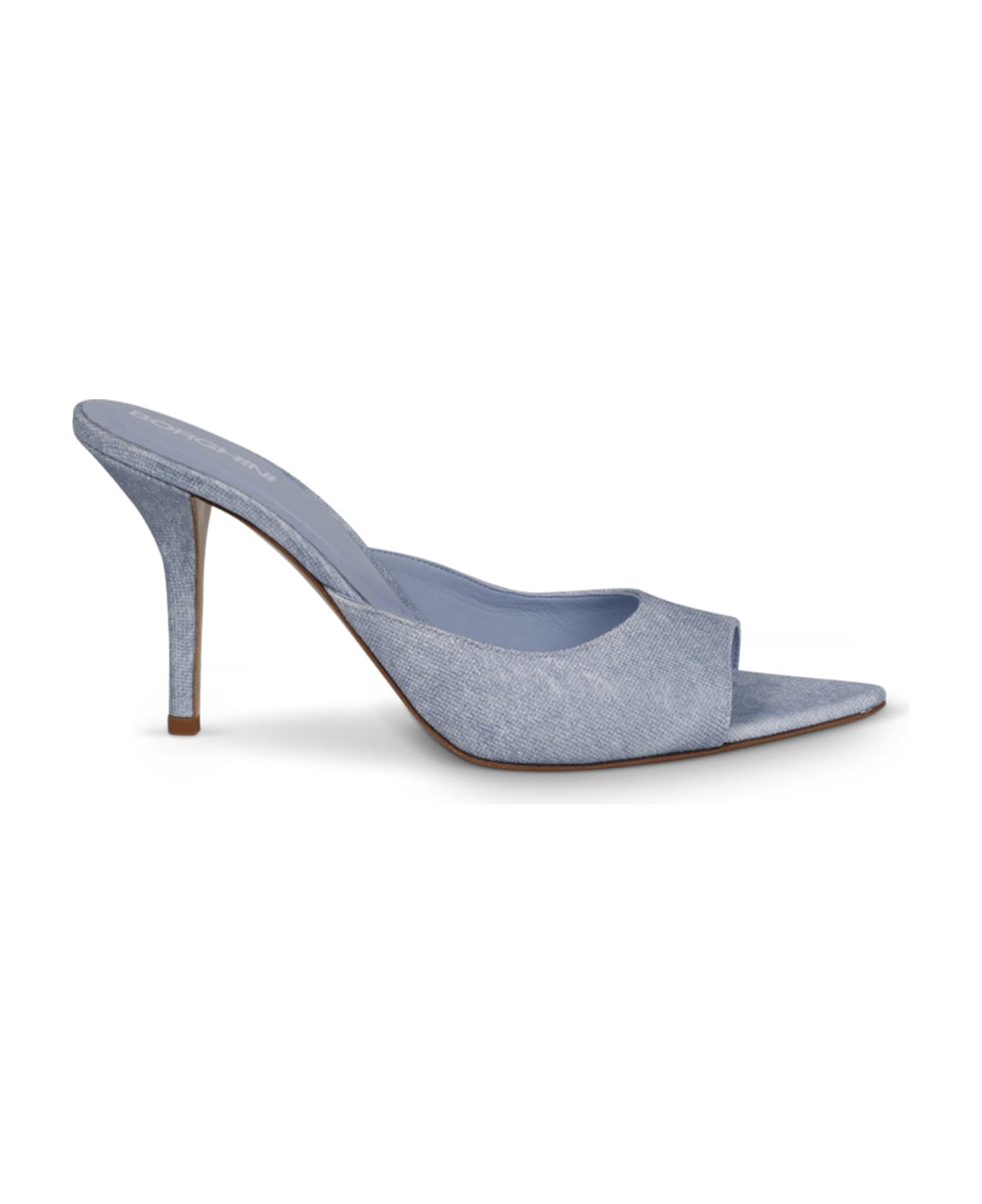 Open-toe mules from GIABORGHIN X PERNILLEDenim. Slip-on style. Open-toe. Pointed toe. High stiletto heel. Branded insole. 100% Fabric, 100% Calf leather. Made in Italy.