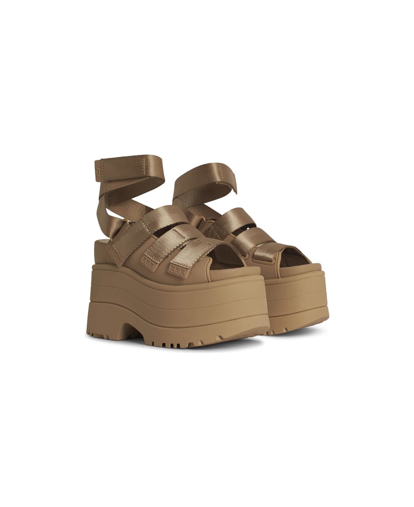 Open toe, triple front laces, adjustable strap, tone-on-tone platform, rubber sole\nSole height 10cm