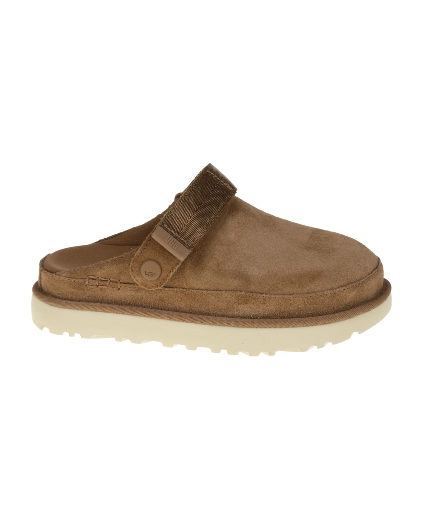 Ugg Sabot in camel suede, adjustable velcro closure on the back, rubber sole.