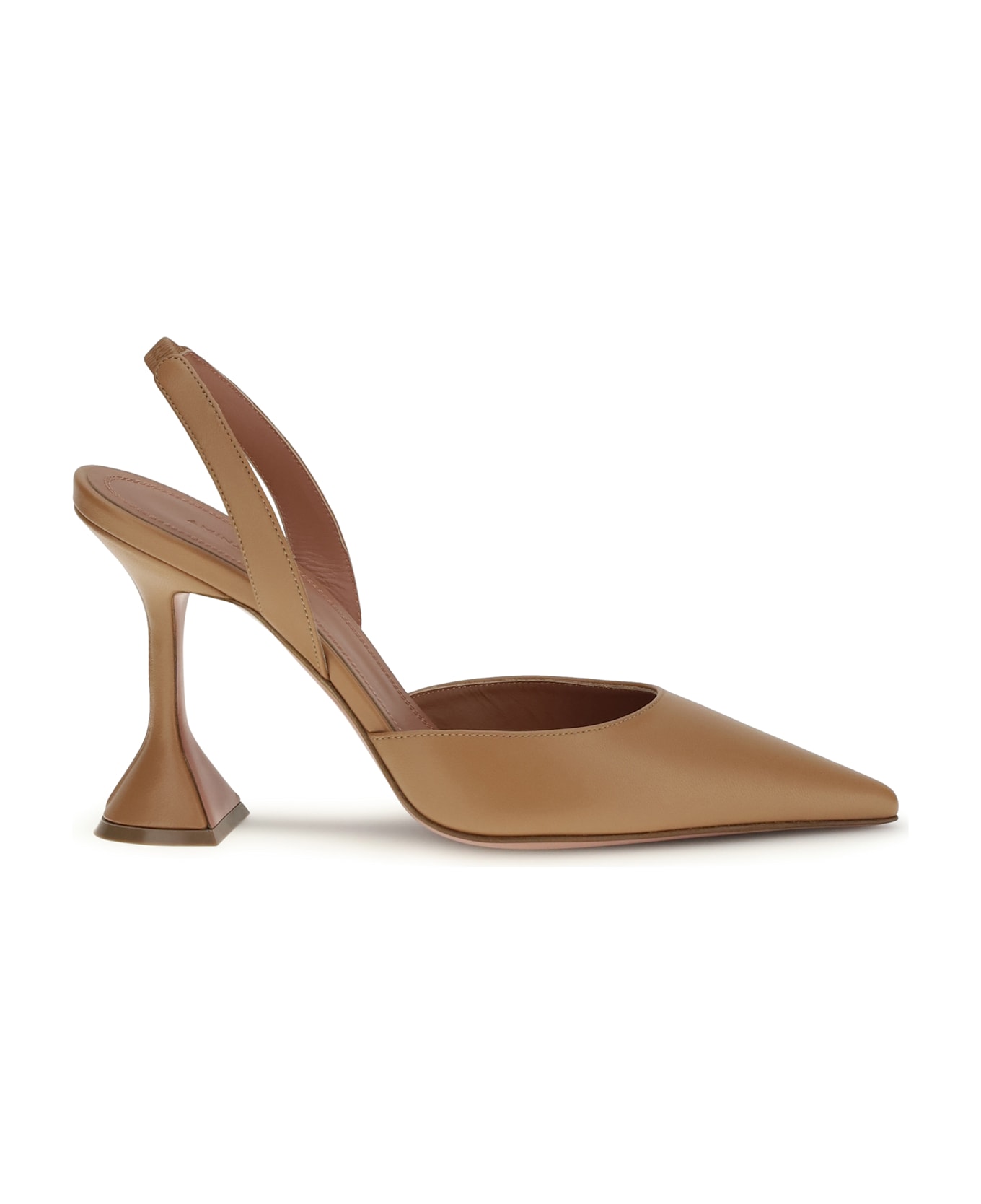 The holli slingback pumps by amina muaddi are crafted in a refined coffee shade and feature a tapered toe and the brand's iconic sculpted heel. the back strap ensures a feminine and comfortable fit, while the sleek design lends elegance and modernity.