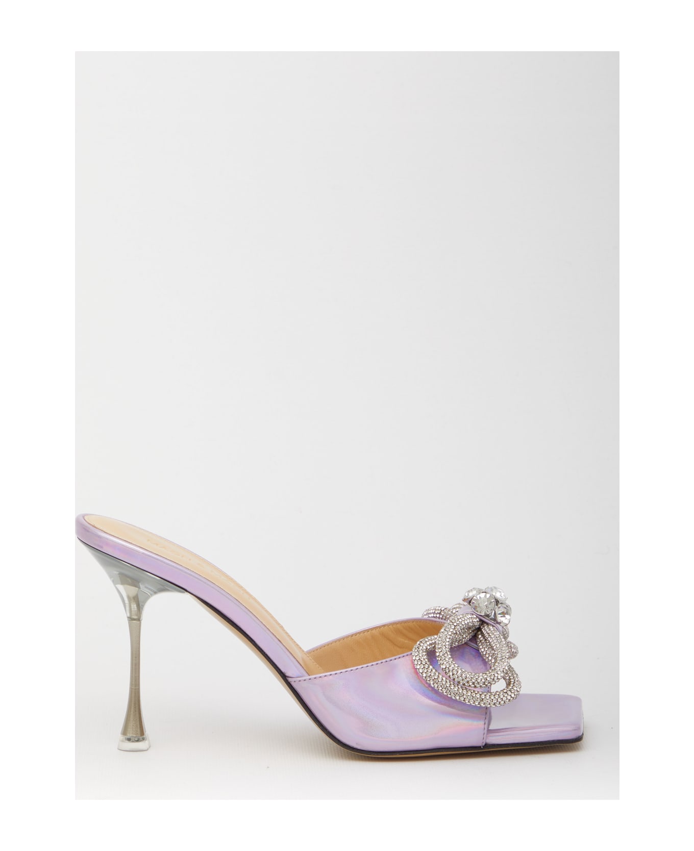Iridescent leather sandals with micro crystals and double front bow. They feature squared toe, thin heel and leather sole.