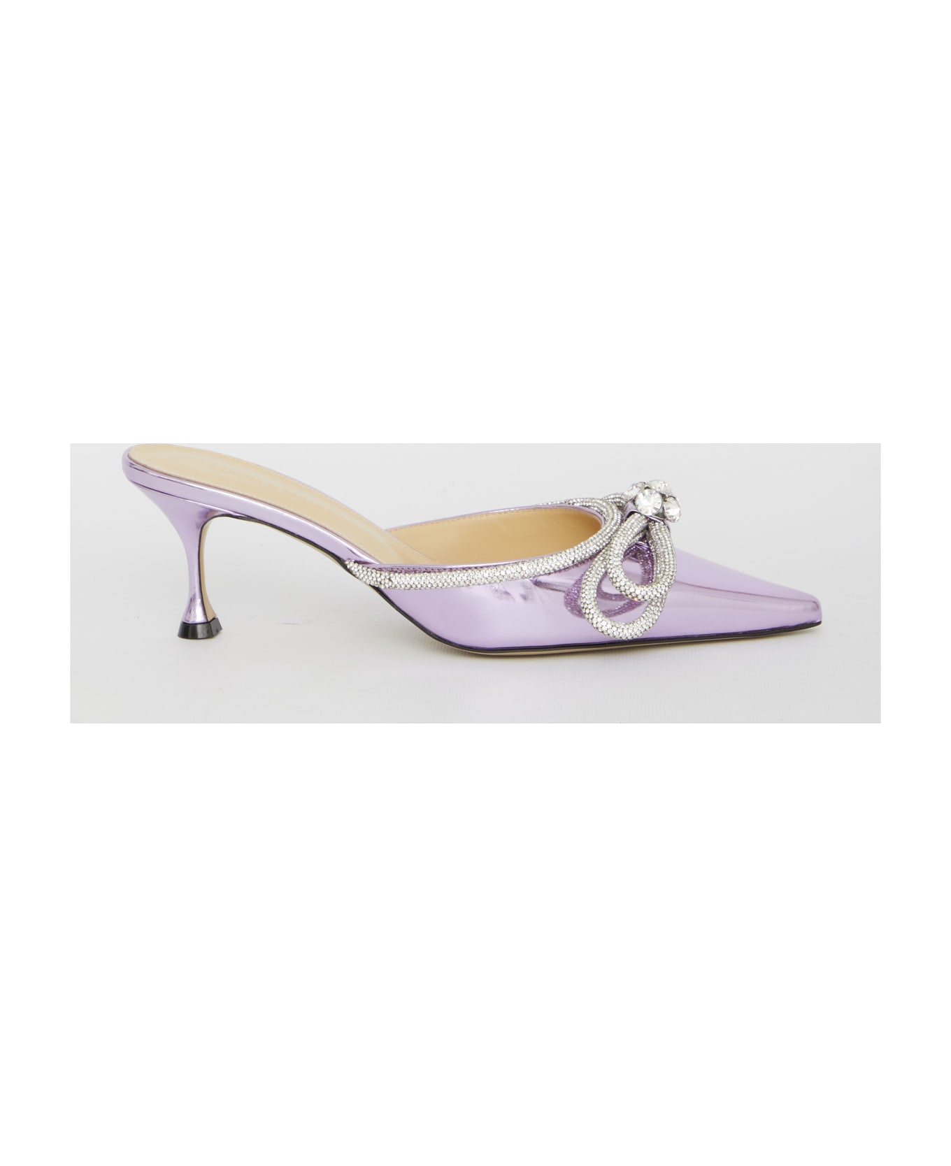 Iridescent pink leather sandals with micro-crystal embellishments and crystal double bow on the front. They feature pointed design and kitten heel. Leather sole.