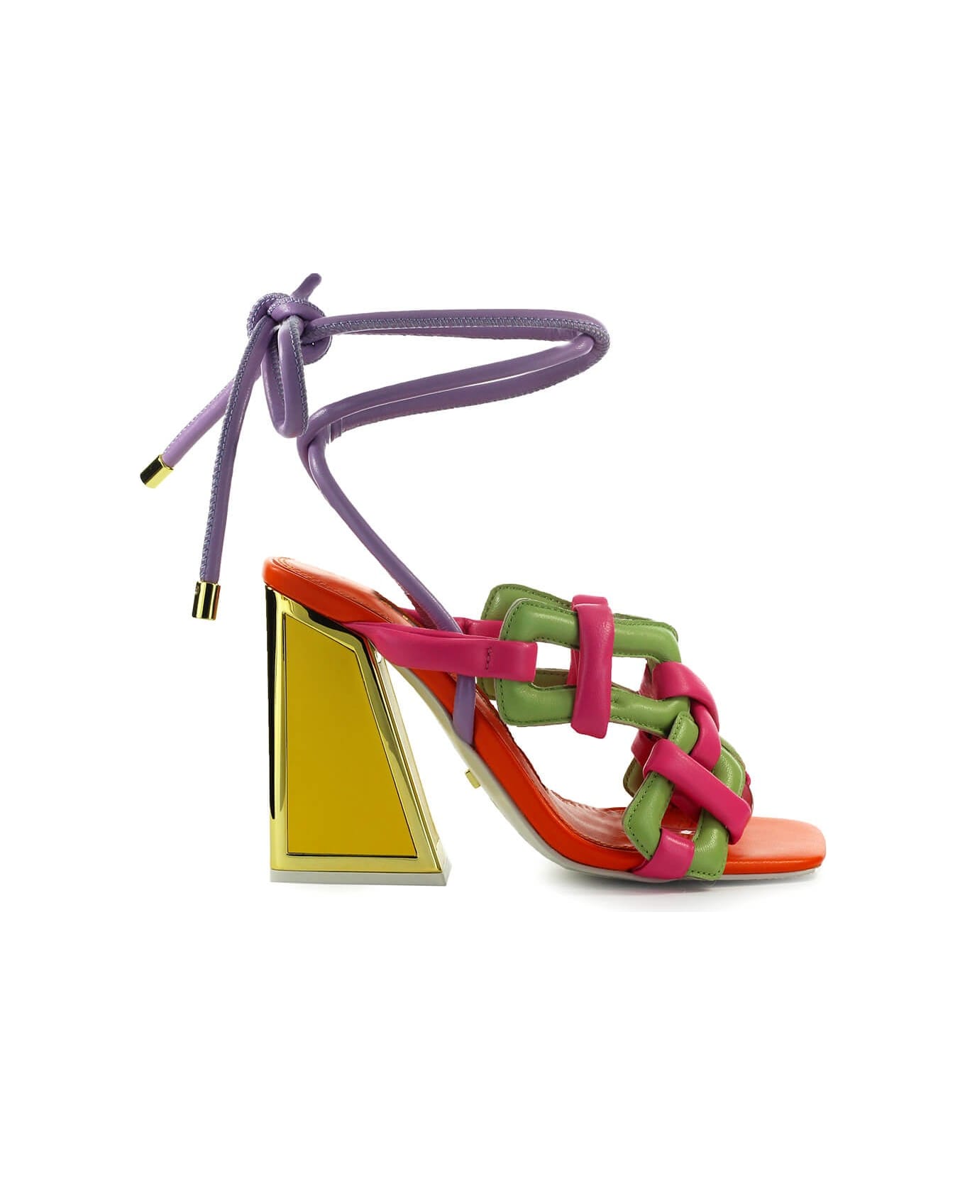 Monira Kicker sandal by Kat Maconie made of soft orange leather. Crossed details in shades of green and fuchsia on the front, lilac leather laces to tie at the ankle, square toe and contrasting block heel. Leather sole, height 10. 5 cm.