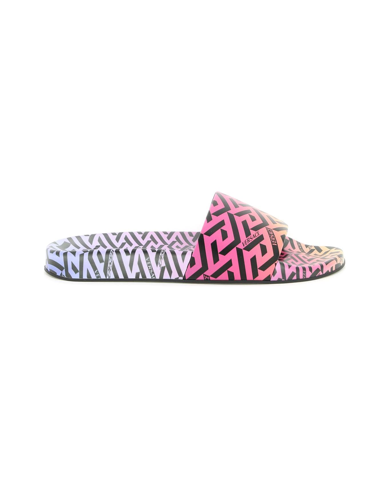 Versace slides with La Greca multicolored print all over. Anatomical footbed and rubber sole. Composition: 100% PV