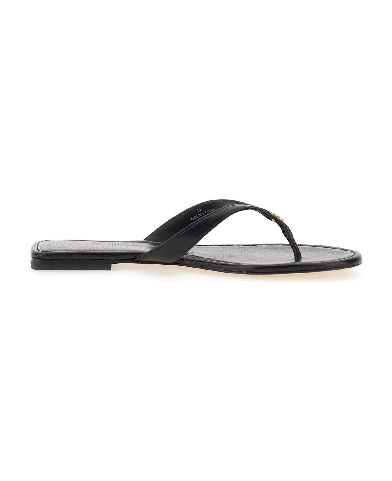 Tory Burch women's leather "Classic Flip Flop", black, thin laces, logoed brass pendant, padded insole, shiny leather sole, fabric case included.