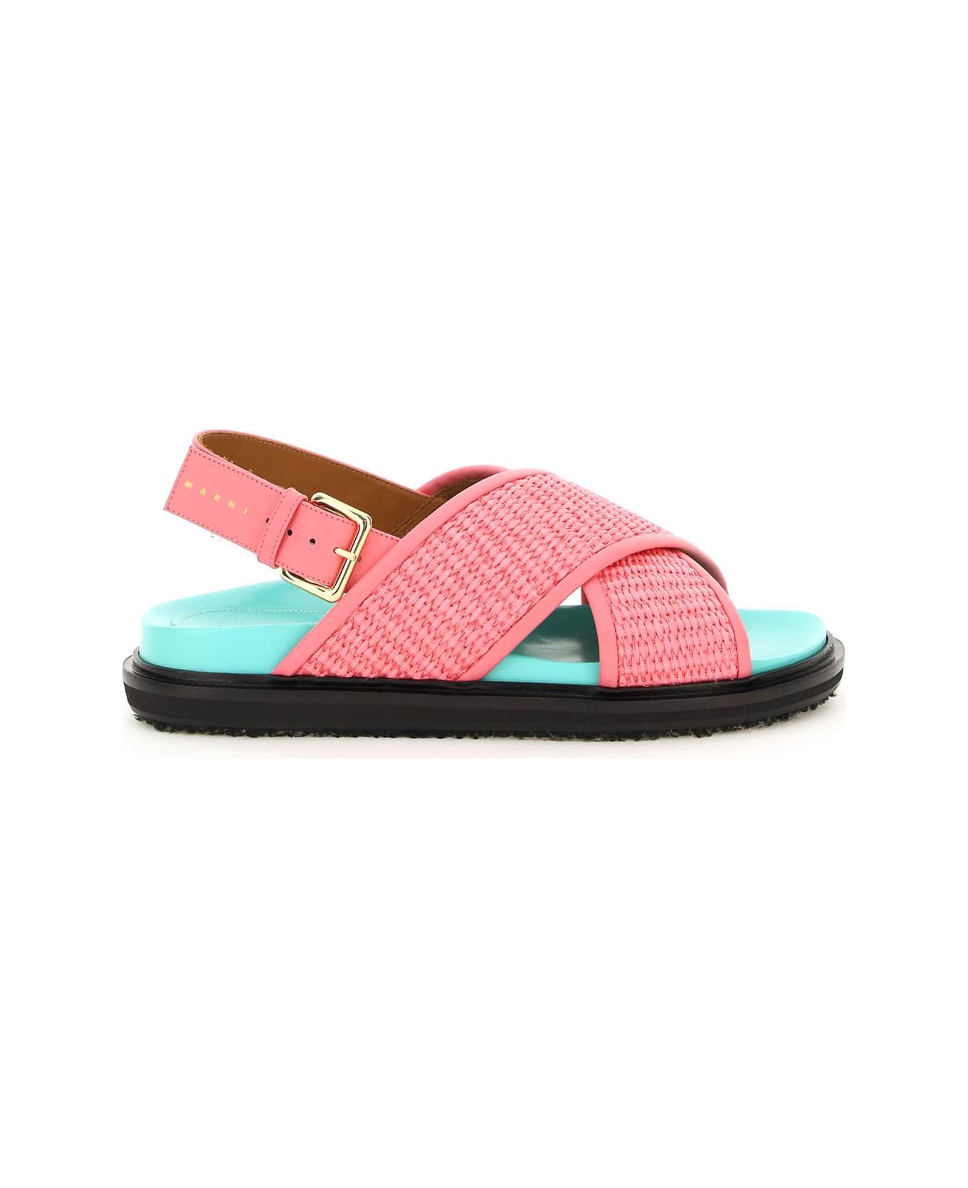 Marni Fussbett sandals with criss-crossed front strap crafted in woven raffia and smooth leather. Back adjustable strap with gold-tone metal buckle and gold-tone lettering logo print, leather moulded insole, jute and rubber sole.