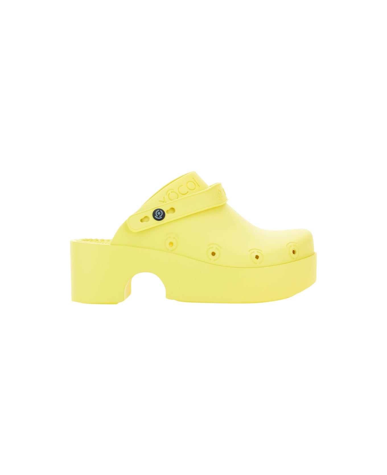 Low mules by xocoi, round toe, slip-on style, block heel, platform design, engraved detailing on side panels, iconic brand monogram engraved on front, monochrome pattern.