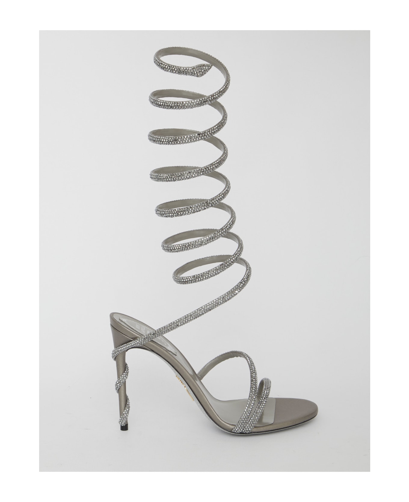 Margot 105 sandals in silver-tone leather and satin with silver-tone snake-head crystal-encrusted straps. Open toe, thin heel with crystals and glitter leather sole. Heel height: 10,5cm ITA size.