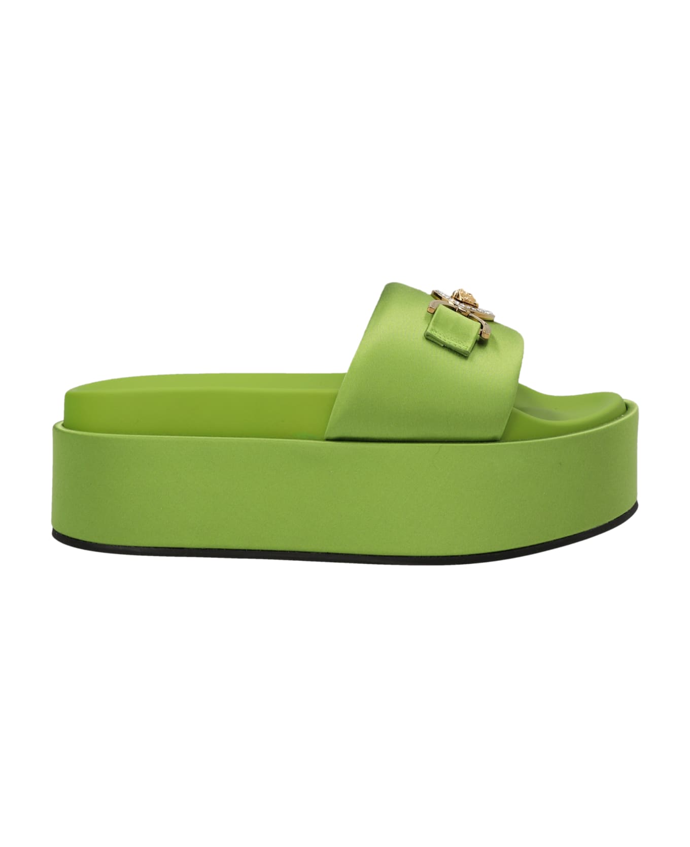 Satin sandals with platform, a 'Medusa Biggie' emblem appliqué with crystals. Composition: 100% viscose