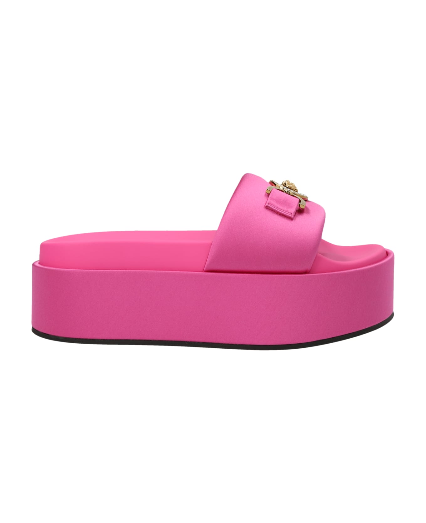 Satin sandals with platform, a 'Medusa Biggie' emblem appliqué with crystals. Composition: 100% viscose