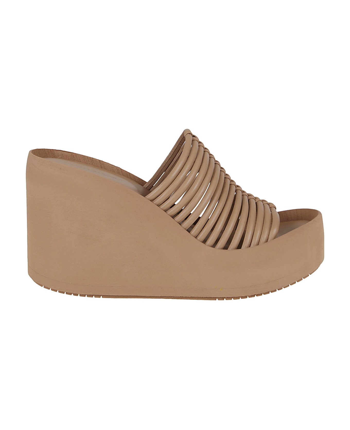 Meira mules in leather BY PALOMA BARCELO`. Upper part made up of bands; 10cm high microfiber wedge