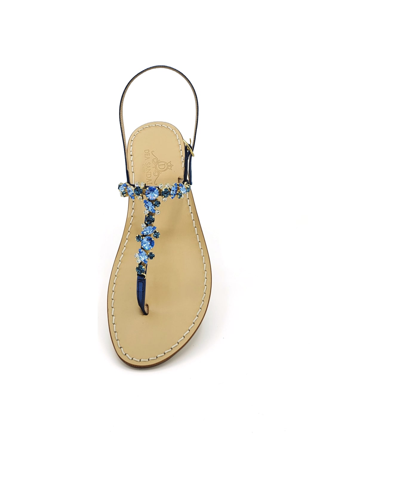 Navy Blue Licampi Jewel Sandals with navy blue laminated leather straps, natural leather sole jewel accessory with light blue, blue and natural crystals Swarovski certificate.