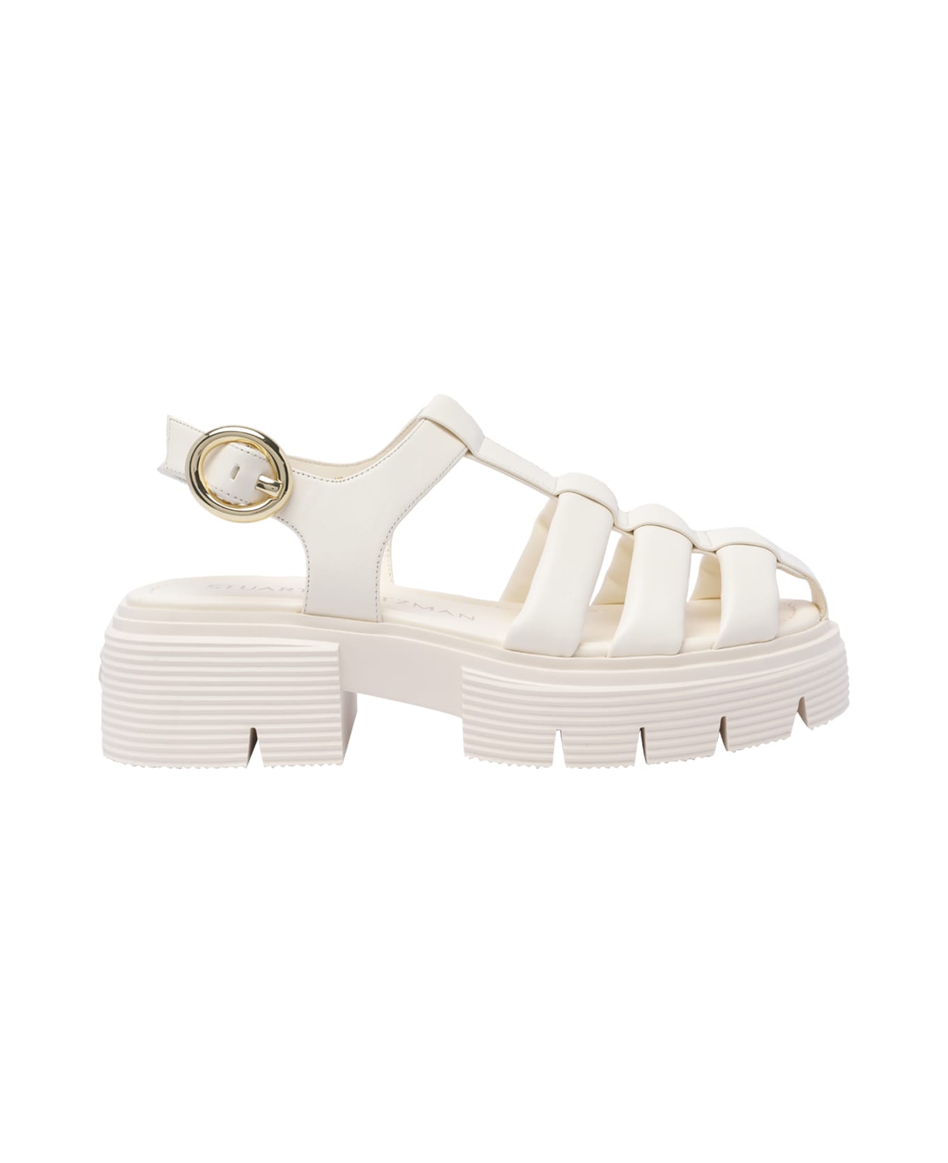 Stuart Weitzman white Nolita fisherman sandals, lateral buckle closure, leather upper, round toe
