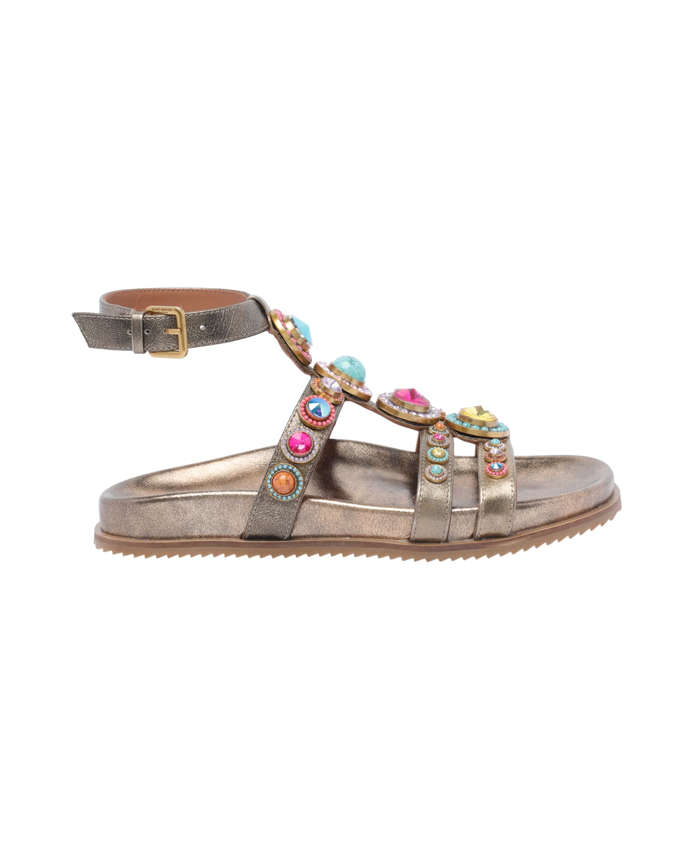 Kurt Geiger bronze Octavia Flexi Gladiator sandals, round toe, adjustable buckle closure on ankle, leather upper and rubber sole, bronze effect, with multicolor crystals and stones allover