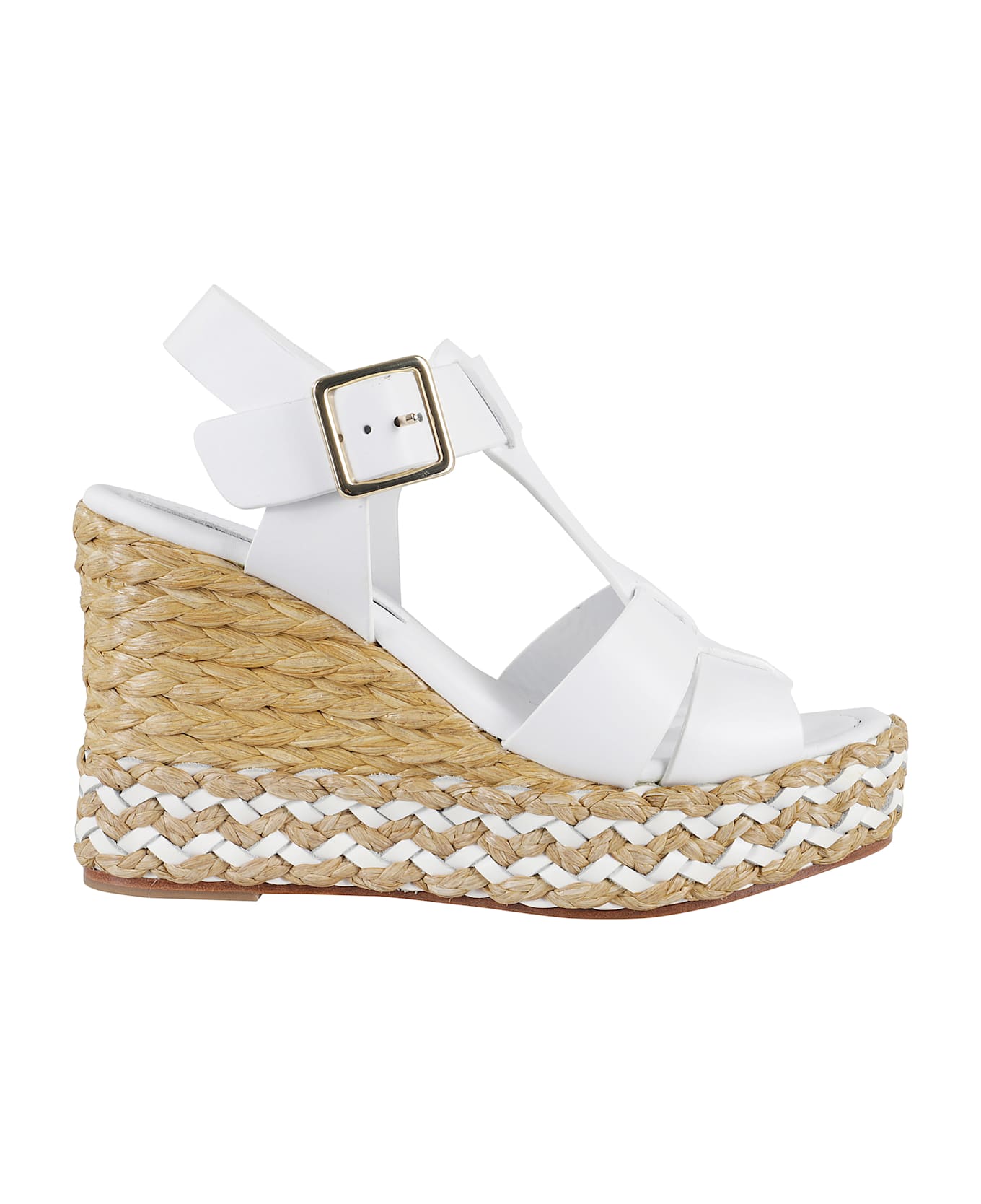 Olivia sandal - Paloma Barcelò - White color - Nappa leather upper with woven design - Square toe - Adjustable strap with buckle - Raffia wedge - Platform height: 11 cm - Rubber sole
