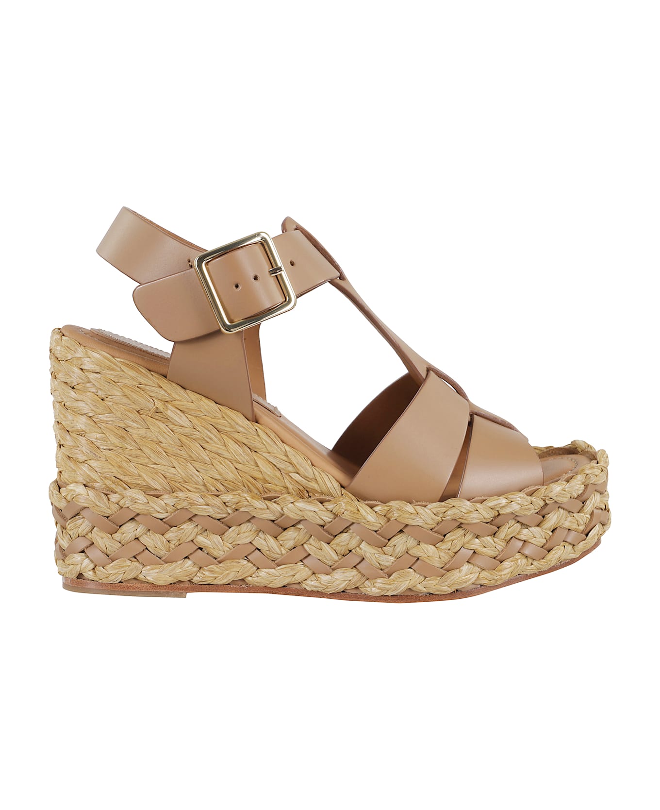 Olivia sandal - Paloma Barcelò - Camel color - Nappa leather upper with woven design - Square toe - Adjustable strap with buckle - Raffia wedge - Platform height: 11 cm - Rubber sole