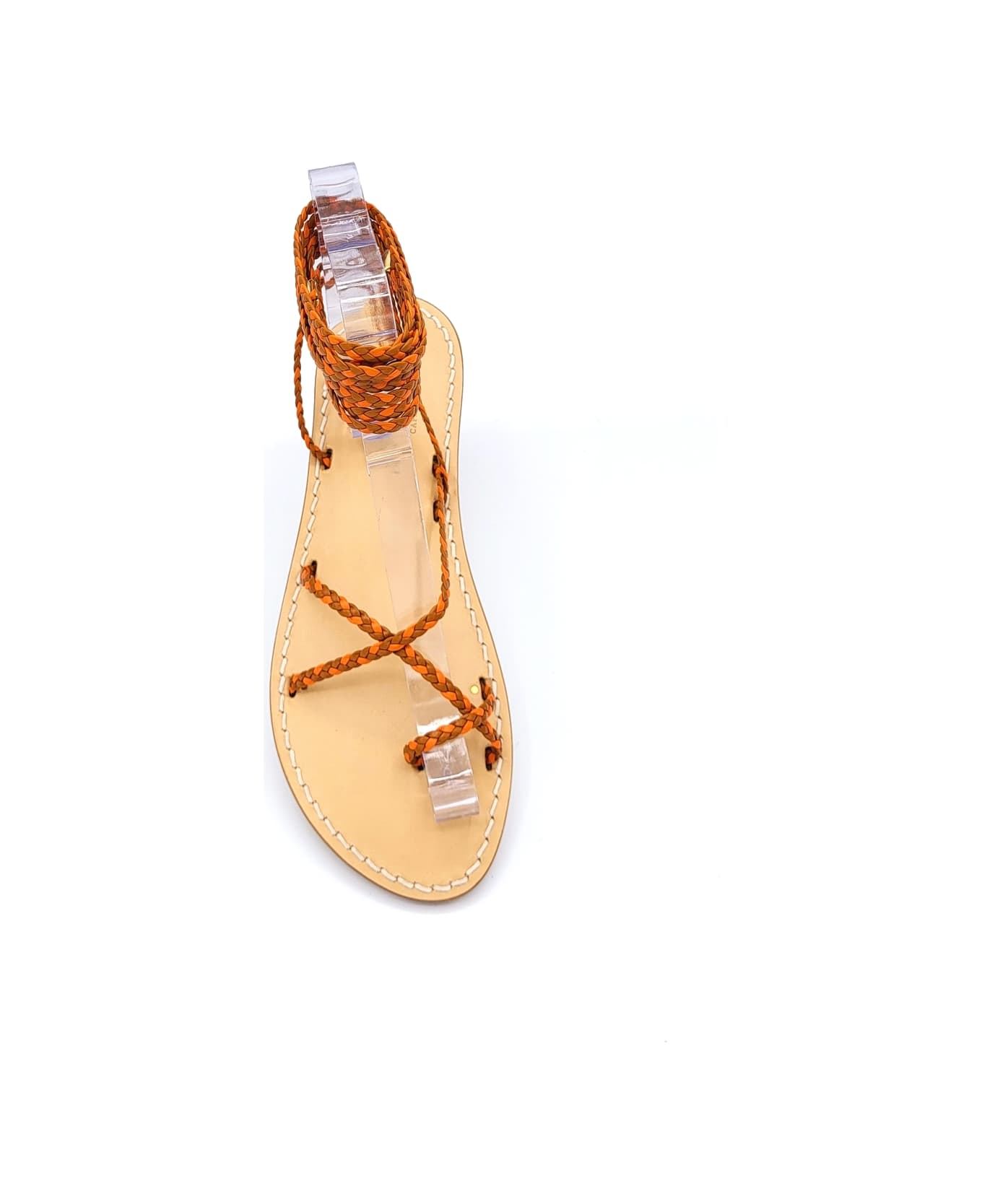 Orange and Caramel Leather Gladiator Sandals with woven leather straps, caramel and orange colour, ankle closure, natural leather sole, leather heel.