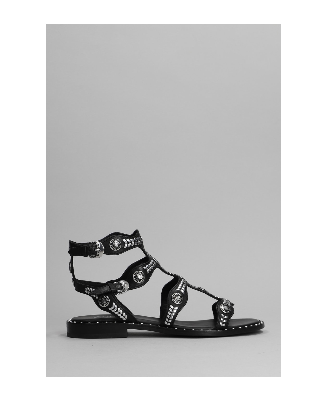 Pacha Flats in black leather, open toe, ankle straps, studs detail, silver hardware, leather sole, 100% leather, Made in Italy