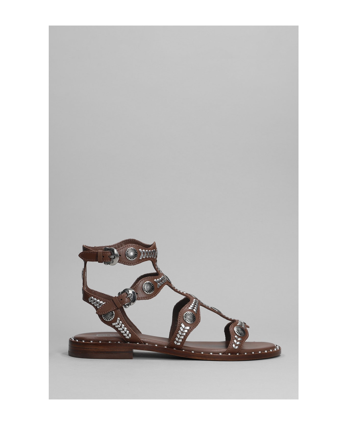 Pacha Flats in dark brown leather, open toe, ankle straps, studs detail, silver hardware, leather sole, 100% leather, Made in Italy