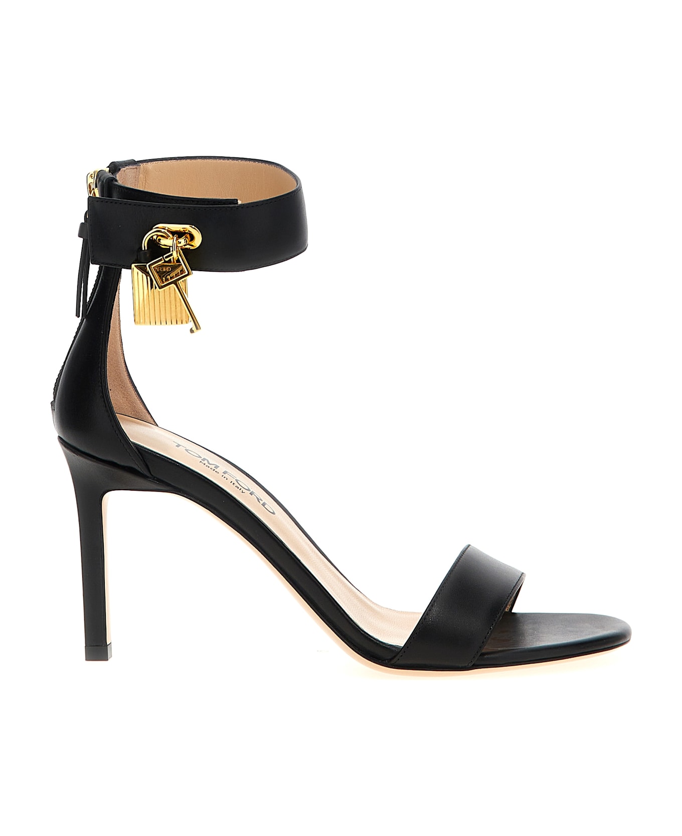 Leather sandal, ankle strap with padlock charm, back zip closure, stiletto heel, leather sole.