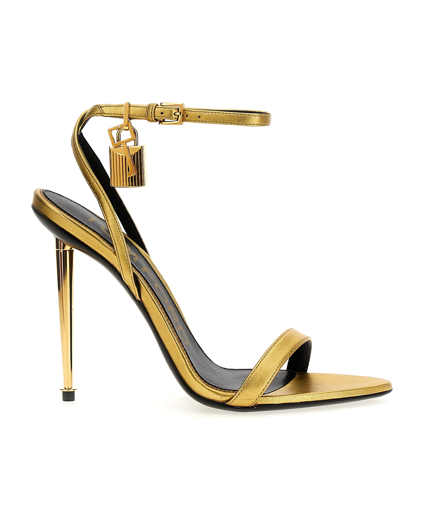 Laminated leather sandals, ankle strap with padlock charm, metal heel.