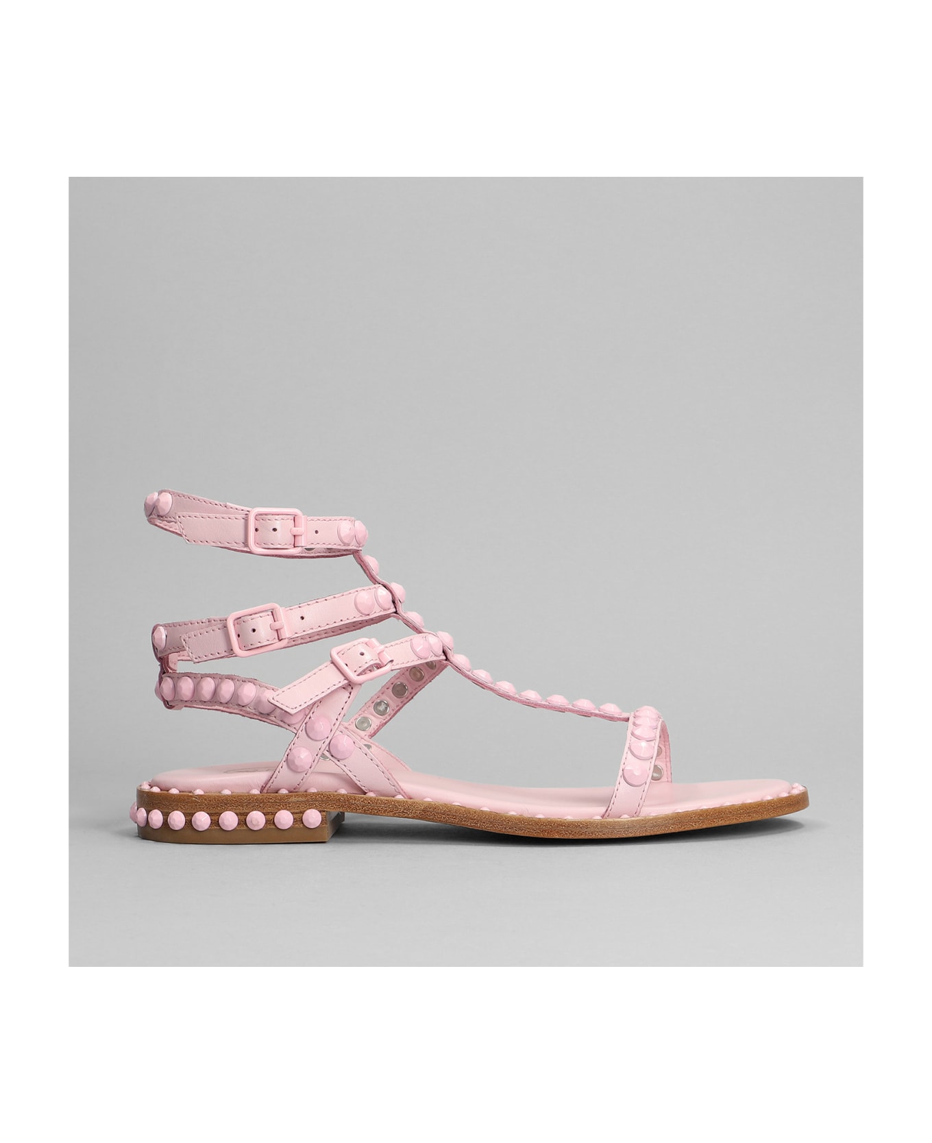 Play Bis Flats in rose-pink leather, open toe, ankle straps, studs detail, leather sole, 100% leather, Made in Italy