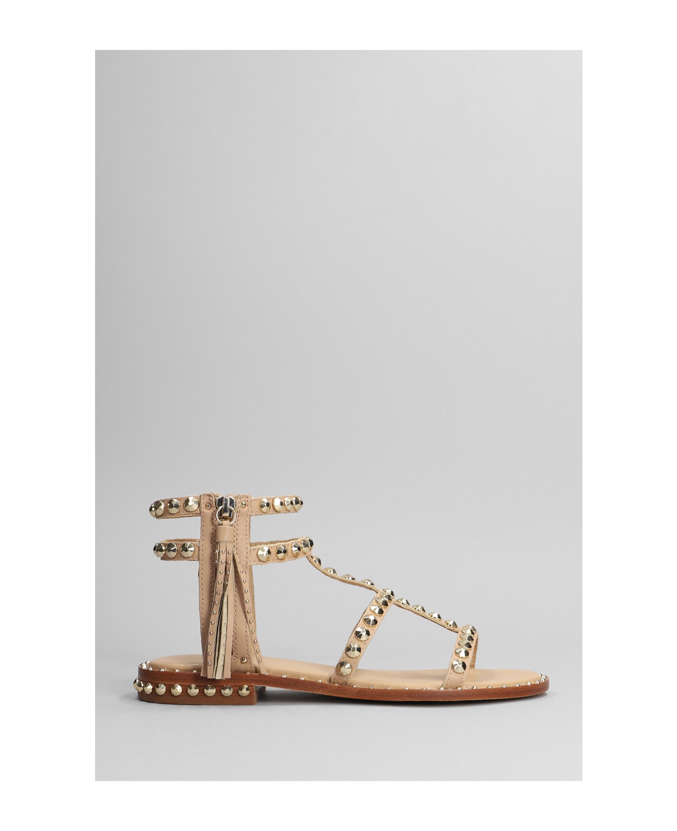 Power Flats in powder leather, open toe, ankle straps, studs detail, leather sole, side zip closure, gold hardware, 100% leather, Made in Italy