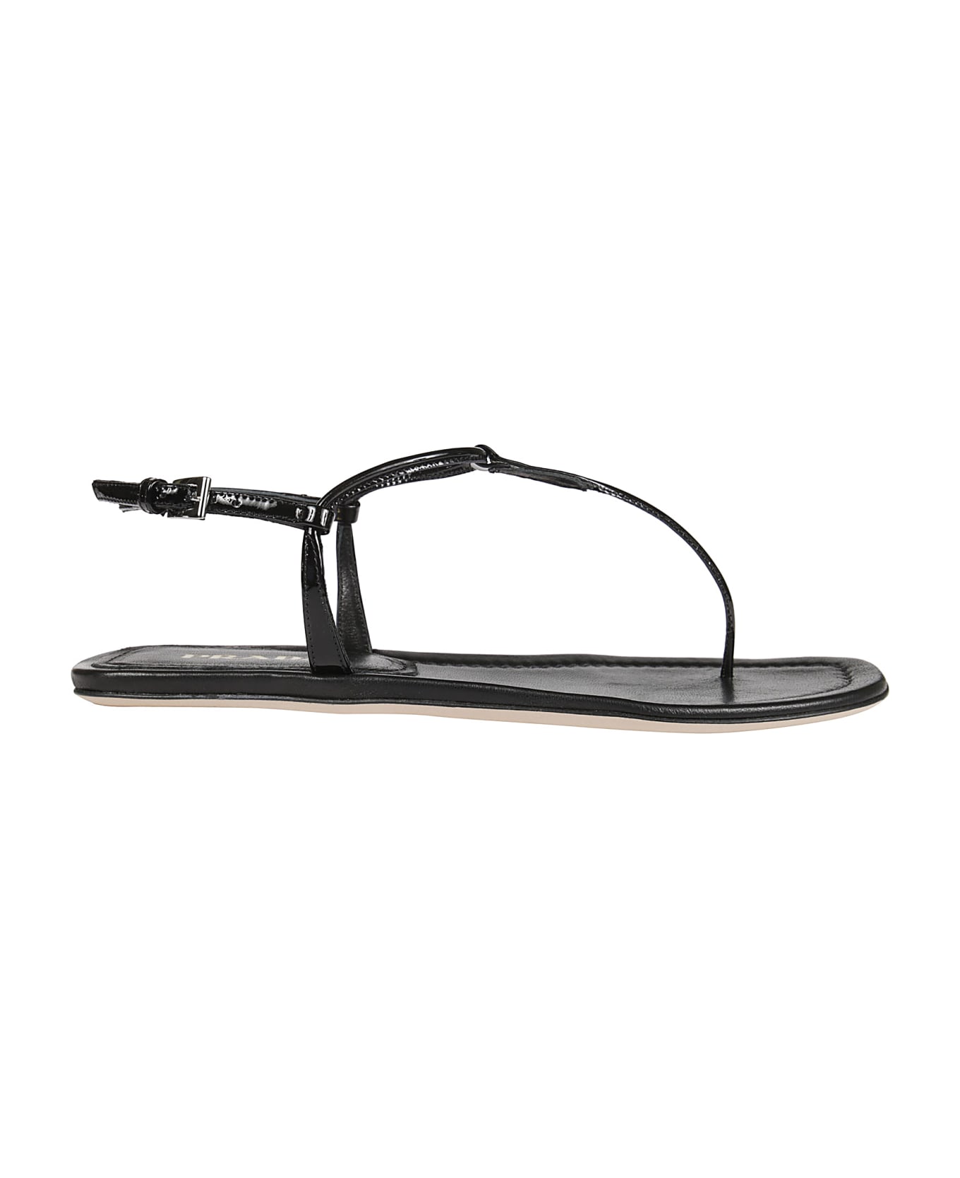 Skinny Strap Sandals from Prada: Black Skinny Strap Sandals with square toe, T-bar strap, ankle strap with side buckle fastening, flat rubber sole and branded insole. Composition: 100% Patent Leather