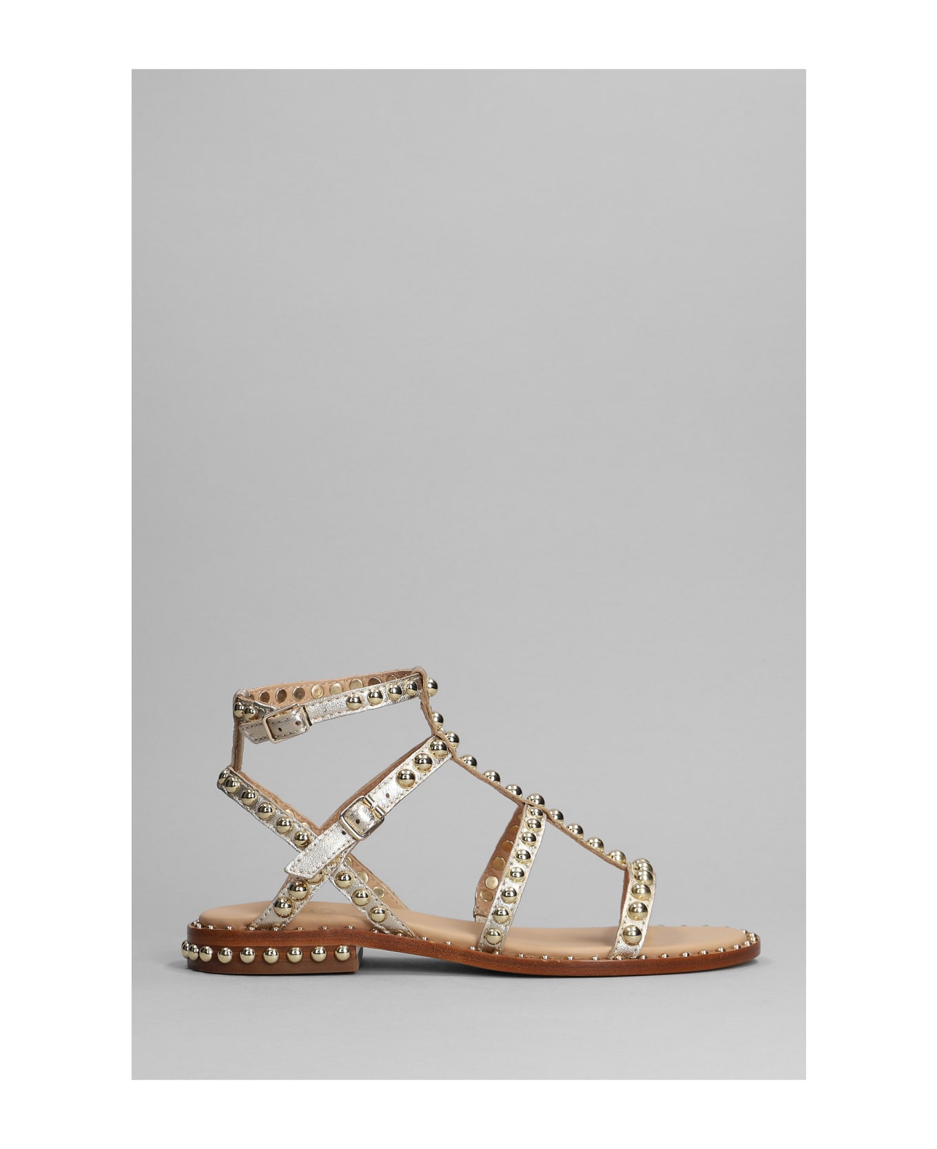 Precious Flats in gold leather, open toe, ankle straps, studs detail, gold hardware, leather sole, 100% leather, Made in Italy