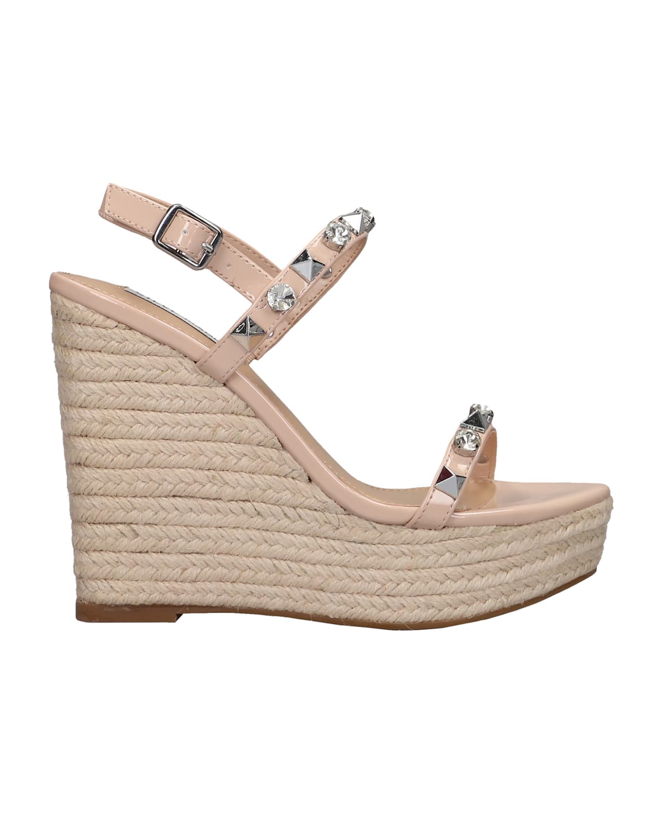 Prime Time Wedges in powder patent leather, ankle strap, two straps, crystals detail, juta wedges sole, 130 mm heel, Made in China