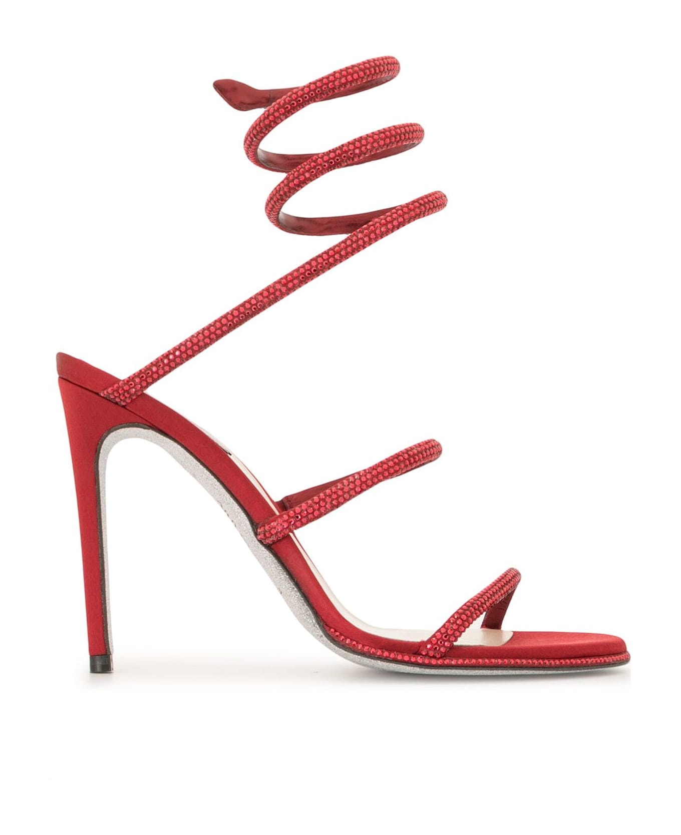 Red satin sandal, thin straps, crystal embellishments, wrap-around design, open toe, stiletto heel, branded insole, leather sole, heel height 11 cm Composition: Satin, 100%