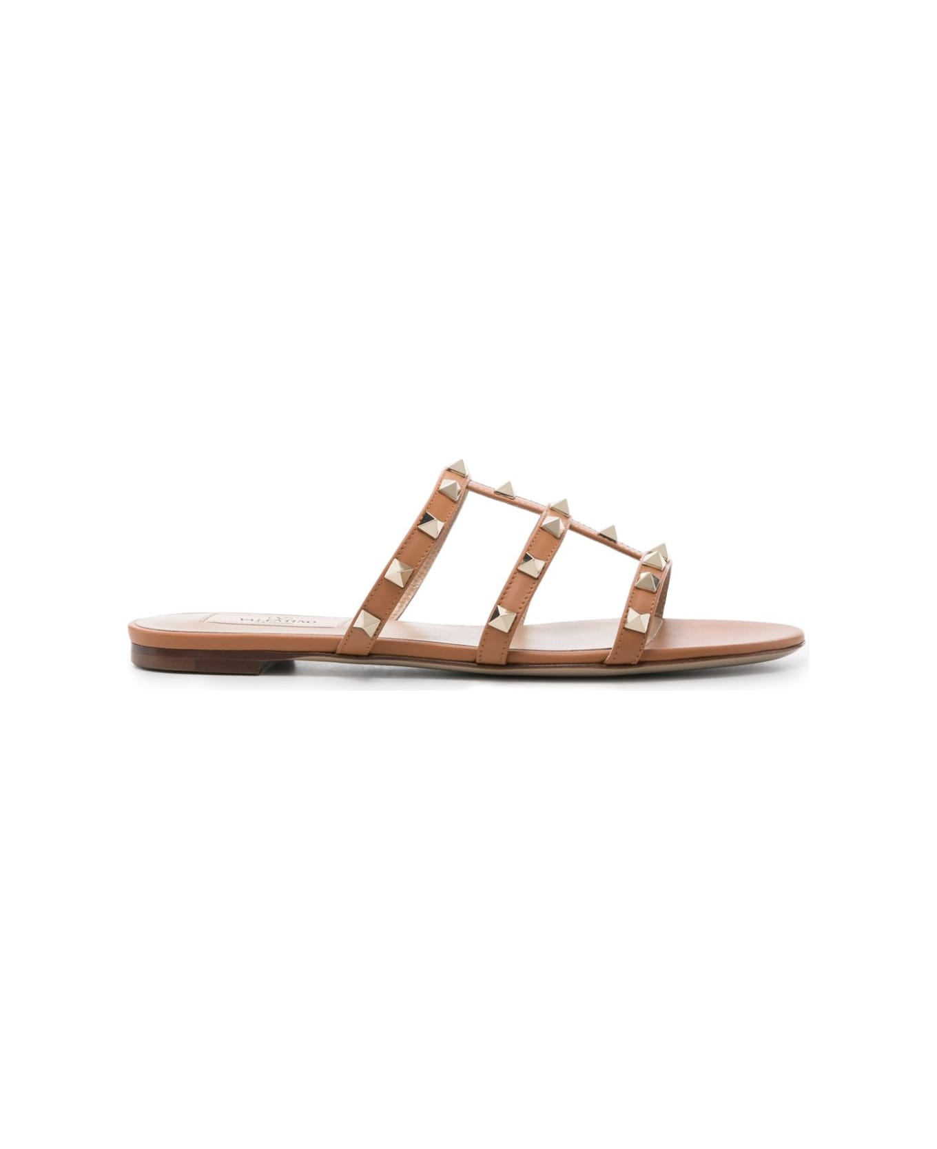 camel brown calf leather smooth grain open toe gold-tone Rockstud embellishment caged design branded leather insole flat leather sole slip-on style Composition: Calf Leather, 100%