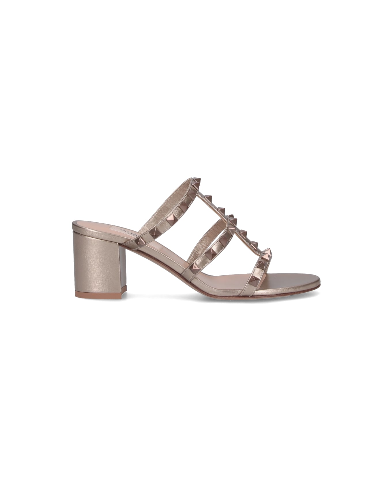 Valentino Garavani "Rockstud" slider sandals in beige laminated nappa leather with metallic effect, tone-on-tone metal details, round toe, top strap, stud details, slip-on fit, square heel, leather sole. Composition: 100% Leather