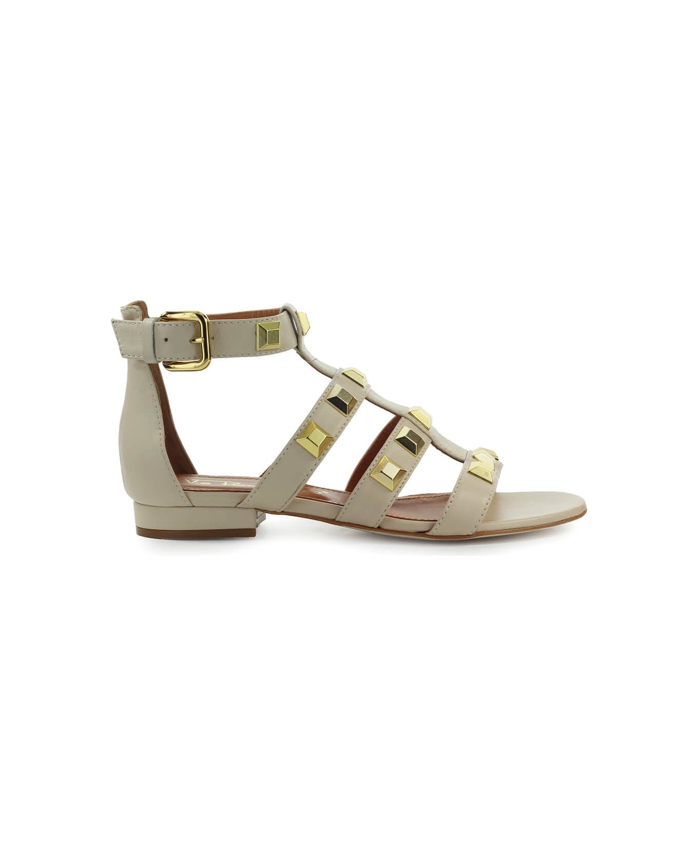 Via Roma 15 sandal made of ecru colored leather, embellished with golden studs applied along the strips. Soft leather insole with logo, ankle strap closure and leather sole. Height 2 cm.